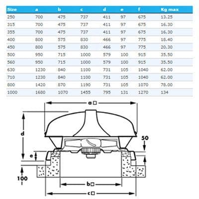 The Vent Axia ESR50034 500mm three phase, 4 pole Euro Series roof fan is designed for either kerb or purlin box mounting on a flat or inclined roof with a mximum pitch angle of 30°.
